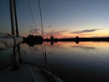 Die Sonne lacht. Schnell raus und Segel gesetzt, schon sind die Kreidefelsen querab und wir lassen Sassnitz hinter uns. Segeln teilweise Schmetterling bis Nordperd. Dort lässt der Wind langsam nach und wir motoren dann über den Greifswalder Bodden knapp am Stubber vorbei in den Stelasund dem Sonnenuntergang entgegen und Ankern direkt mit den letzten Strahlen bei Puddemin und bestaunen den beeindruckenden Sonnenuntergang auf der einen Seite und den Mondaufgang auf der anderen. Es ist immerwieder erstaunlich wie überwältigend die Natur sein kann .Gestern hat hier noch Matthias mit der Vasa gelegen, da haben wir uns leider knapp verpasst... Hab noch kurz auf der Gitarre geklimpert und dann Grog, Labern ,Schlafen...