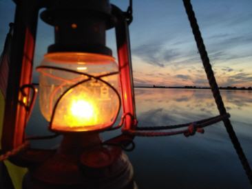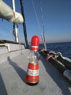 Ich komme gegen Mittag in Schaprode an, Danny is schon seit knapp einer Woche auf dem Boot. Kurzes Hallo und Leinen los. Sommerwetter bei strahlend blauem Himmel. Wir fahren unter Motor rund dornbusch und segeln dann bei leider mäßigem Wind, langsam die Westküste Hiddensees in den Sonnenuntergang. Kurz bevor die Sonne ganz entschwindet fällt dann bei Barhöft der Anker. Petroleumlampe angezündet und danny spielt gitarrre. Der Sternenhimmel ist überwältigend, da es kaum Überstrahlungen gibt. Es ist Brunstzeit und so röhren die Hirsche vom Bock. Es klingt etwas nach Urzeit. Schlafen wie die Steine...