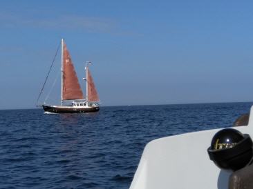 Die Sonne strahlt und das ist auch gut so. Die Nacht war trotz Lüfter doch recht frisch. Frühstücken in Ruhe und laufen gegen 10 Uhr aus, um gegen den moderaten Süd erstmal richtung Stralsund zu tuckern. Setzen dann das Groß und fahren mit achterlichem Wind und über 4 Knoten entspannt das fast leere Fahrwasser Richtung Kloster. diesmal sollte es auf Hiddensee kein Liegeplatzproblem geben. Die Saison ist leider zu Ende. Die ersten nehmen schon ihre Boote aus dem Wasser und obwohl es in der Sonne wirklich schön ist, ist es sehr kalt. Kommen gegen 15 Uhr in Kloster an. Machen ganz in der Nähe der Fischbarkasse Willi fest und gehen durch Kloster um dann im Wieseneck einzukehren. Hiddensee hat sich die letzten Jahre doch sehr verändert. Jahrzehntelang war hier fast Stillstand, aber jetzt werden Wege ausgebaur, Häfen erweitert, Häuser ausgebaut. In der Summe doch eine größere Veränderung. Man sollte auch immer ausreichend Geld dabei haben...Kurzer Strandspaziergang und dann ab in die Koje, zu kalt. Der Lüfter läuft, Stimmung ist gut. Noch etwas klönen und den letzten Abend ausklingen lassen.