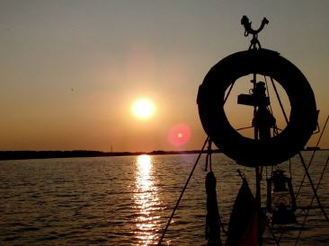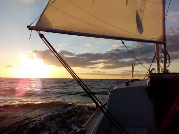 1045 Abgelegt Yacht kommt wieder rein uns entgegen wollte nach Sassnitz und hat gegenan aufgegeben 1022 SO 4-5 Böen 6 Welle 1m setzen gereffte Fock und reiten mit achterlicher Welle bei 4-5 kn, 1130 SO4 fieren Fock 4 kn, 1300 Kap Arkona querab Wind nimmt auf 4-5 zu bis 7 kn nur mit Fock überlegen noch rund Hiddensee zu segeln, aber der Tag is kurz segeln hart am Wind in das Hiddenseefahrwasser und dann lassen wir uns vor Top und Takel ins Hafenbecken treiben und motoren dann nach Langeort...sehr ruhig hier...Sonnenuntergang und Rum 27 sm, 4,6 kn im Schnitt Topspeed 8 kn