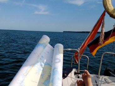 0445 viel Welle daher Anker auf, NW gute 3 Bf wolkig 1020 Segel gesetzt 4,5 kn 0530 NW4 bis 6 kn Fahrt 0815 Gellen NW3 1040 Segel eingeholt, gegenan nach Schaprode 1240 Schaprode angelegt, Stefan abgesetzt, 33 sm