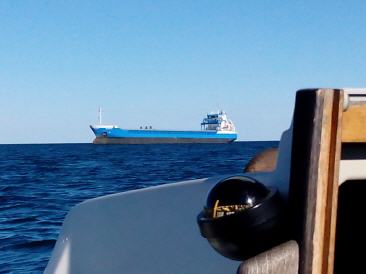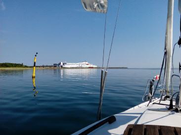 1020 O 3-4 klar Segel gesetzt, Anker auf, 4,5 kn 300 grad, Sonnenschirm als Bimini 1200 Dornbusch achter aus 1330 gute Ost 4, 5,5 kn 1022 hPa, viel Welle 1420 Kadettrinne voraus, Groß gerefft 1450 Stenafähre hinter uns durch 1520 Fock geborgen, Kurs 270 4,5 kn, Welle von achtern 1845 schwere Welle von achter trifft uns, plus Kreuzsee 1945 Segel geborgen 2000 angelegt Harbbölle 44 sm