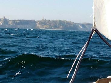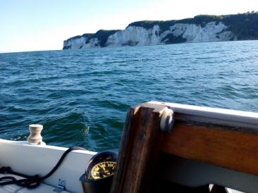 Sind 9 Uhr los Richtung Falster, außenrum um den Dornbusch. Superwetter, erstmal wenig Wind, aber lieber so als umgekehrt. Stefan und ich sind guter Dinge und so kommen wir segelnd und motorend am Windpark Baltic 1 vorbei. Ich hole die Gitarre raus und wir genießen das Südseefeeling. An der Kadettrinne nur leichte Aufregung. Sind tatsächlich aus Kollisionskurs mit einem Frachter, verlangsamen etwas unsere Geschwindigkeit und schon sieht es auf dem AIS schon deutlich freundlicher aus. Das war es dann auch schon mit der Kadettrinne. Der Dornbusch entschwindet und klar voraus die Kreidefelsen von Mön. Heute ist extrem gute Sicht. Der Wind frischt auf und wir können gut segeln. Leider nimmt damit aber auch die Welle zu. Inzwischen haben wir auch ein Reiseziel ins Auge gefasst: Kopenhagen. Einer der wenigen weißen Flecken unserer bisherigen Reisen. Es liegt von Rügen aus im Nordwesten und da die vorherrschende Windrichtung Nordwest ist, war dies für die Jolle immer irgendwie unerreichbar. Aber diesmal liegt Südost an und daher beschließen wir an Klintholm vorbei weiter Rödvik zu segeln. Als wir endlich im Sonnenuntergang Höhe Rödvik sind, erscheint uns der Hafen zu unruhig und unüberschaubar bei diesen Wind und Wellenverhältnissen und wir beschließen weiter zu segeln und rauschen weiter zu dem kleinen Fischereihafen Bogeskov. Inzwischen ist es finster und kaum noch was auszumachen. Dank Plotter sind wir aber guter Dinge die Hafeneinfahrt zu treffen. Mächtig Welle inzwischen, aber alles geht gut. Im Hafen alles entspannt. machen fest und sind nach 13 Stunden total knülle und froh endlich schlafen zu können. Kurz bevor wir das Licht löschen, wird noch vom dänischen SAR ein Motorboot mit Maschienenschaden eingeschleppt. Vier Männer mit Schmimmwesten auf dem recht kleinen SAR Schlauchboot. Respekt. Schlafen, draußen tobt das Meer uns in den Schlaf.