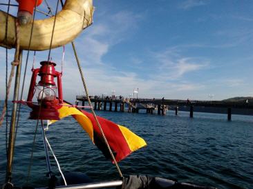 Wieder strahlt die Sonne. Leider ist relativ viel Wind. Wandern noch etwas über die Wiesen am Deich lang und legen dann ab. Auf dem Weg nach Peenemünde sitzt ein Segel knapp neben der Fahrinne fest. Ein Fischer versucht schon sein Bestes und am Horizont kommt schon der Seenotkreuzer. Dieser fährt knapp an uns mit Vollgas vorbei, so das wir nun fast Seenot haben. Völlig unnötig dieses Verhalten...Machen spät am einsamen neuen Schwimmsteg mitten in dem riesigen Becken von Peenemünde fest und lassen den Abend mit Wein und viel Gesprächsstoff ausklingen.