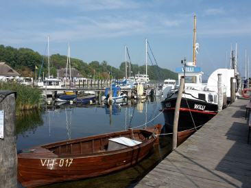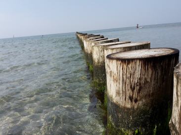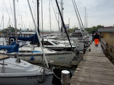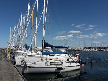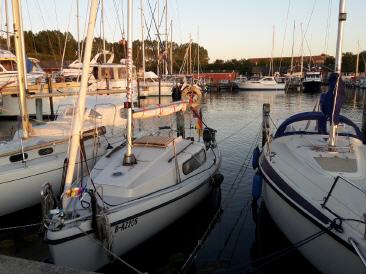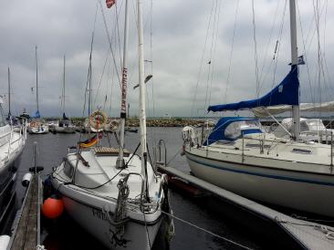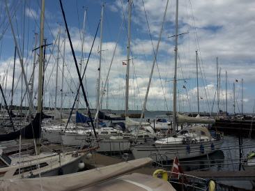 Haben noch genug Brötchen vom Vortag und Frühstücken erstmal ausgiebig. Dann heißt es wieder Motor an und bei erst wenig Wind gegenan durch den Strelasund Richtung Greifswalder Bodden. Fahren zur Belustigung der Urlauber mal ganz nah an der Stahlbroder Fähre vorbei und dann weiter raus auf den Bodden. Durch die Thermik nimmt der Wind aber leider auf 3-4 BF zu und es wird doch recht ungemühtlich. Drehen daher etwas seitlich Richtung Lauterbach und bekommen so die Welle etwas querer. Fahren an Vilm vorbei und Robi schwelgt in Erinnerungen aus seiner Kindheit, wo er direkt gegenüber mal baden war. Überlegen nach Baabe oder Seedorf zu fahren. Nach dem Betrachten diverser Bilder im Internet fällt die Entscheidung Zugunsten von Seedorf. Leider kommt wieder Hochnebel auf und uns auch ein Fahrgastschiff entgegen. Die Anfahrt nach Seedorf verdaddeln wir dann fast, da wir zu weit vom Fahrwasser abkommen und der Tieffenalarm uns dazu auffordert, irgendwas an unserem Kurs zu ändern. Der Hafenmeiser winkt uns dann auch schon zu und weist uns einen Platz an. Seeeehr schön hier...Wenn auch nicht ganz günstig, aber hier is wirklich gut.Binnenfeeling. Robi bekommt endlich sein WLAN und dann gehen wir essen. Während des Essens kommt dann der Regen...Schwein gehabt...