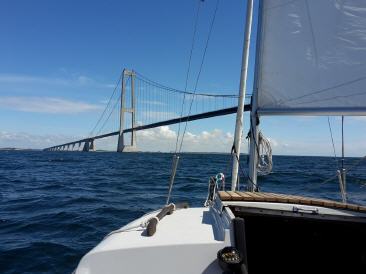 Haben den ganzen letzten Abend die Wetterprognosen durchgearbeitet und es gibt etwas nachlassenden Nordwestwind ab 11 Uhr und der dän. Wetterdienst beharrt standhaft darauf, dass dann auch die Welle nachlassen soll. Ich habe trotzdem gemischte Gefühle. Ist halt doch nicht ohne quer über den großen Belt mit der Jolle. Als ich vor 10 Jahren hier lang bin, hatte ich mir vorgenommen das nie wieder zu machen. Zu große Wellen, Strömung und Schifffahrt. Aber heute soll alles von achtern kommen und es wird uns so oder so nach Aggersö spülen. Also legen wir gegen 11 Uhr ab und in der Abdeckung geht es dann erst noch ganz entspannt los. Setzen das Groß und es geht gut voran. Nach kurzer Zeit is die Abdeckung weg und schon haben wir große Wellen, welche leider auch etwas seitlicher kommen und es rollt ohne Ende. Wind bleibt aber moderat bei 4 Bf. Und wie schon damals kommt die Brücke einfach nicht näher, obwohl sie zum Greifen nah aussieht. Dirk ist etwas mulmig aufgrund des Seeganges. Ich entspanne etwas, als ich merke, dass es nicht weiter zunimmt. Die Sonne scheint und endlich wird auch mal gesegelt! Was will man mehr? Endlich ist es soweit: zum zweiten Mal kreuze ich nun mit der Jolle die große Beltbrücke. Bin doch etwas ergriffen, als es passiert. Wir queren die Fahrrinne unvorschriftsmäßig, aber für uns am sichersten direkt unter der Brücke. Damit sind wir auch die Berufsschifffahrt los und nun segeln wir beide entspannt der Insel Aggersö entgegen. Es ist ein wirklich schöner Tag und ich bin erleichtert, dass dieser doch ungewisse Teil der Reise nun hinter uns liegt. Zwischen Aggersö und Sjelland ist es wahrscheinlich wegen der Strömungen bis zu 40 Meter tief. Fahren in den Hafen von Aggersö und ich lasse die Gedanken zurückschweifen an die letzten Besuche hier. Treffe den Segler aus Rostock mit seiner "Dark Blue" wieder, welchen ich im Limfjord getroffen hatte. Er hat in Grenaa abgewettert und war dort im spektakulären Motorenmuseum. Auch nicht schlecht. Machen noch einen kleinen Inselspaziergang. Alles wie immer, alles gut. Das Leben kann so einfach sein. Schöner Sonnenuntergang, Wein und Rum.