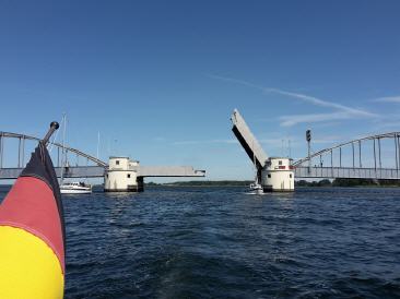 Werde vom kräftigen Schaukeln und Rucken am Anker geweckt. Und zwar um 5 Uhr! Schaue raus und bin sofort genervt. Der Wind hat leider weiter gedreht als gedacht und meine Abdeckung macht so keinen Sinn mehr, sondern ich liege inzwischen mit dem Heck zum Land auf Legerwall. Na super. An Schlaf ist nun nicht mehr zu denken. Pelle mich an und klariere auf. Dann starte ich den Motor und tüdel den Anker auf. Inzwischen sind wir bei unter 2 Metern und der Strand ist nicht weit. Alles geht gut und auf geht es zur nicht all zu fernen Brücke. Wieder das Öffnungszeitenproblem. Aber wie ich im Internet schnell rausbekomme, öffnet die Oddesundbrücke alle halbe Stunde um 15 und 45. Komme genau an und denke erst es tut sich nichts, aber dann geht sie hoch und hupt. Eine Brücke kann hupen? Das ist nun ganz was Neues. Er möchte bestimmt das ich in die Puschen komme. Inzwischen ist die Tiefe von 6 Metern auf 23 Meter gefallen und es gibt eine sehr starke Strömung. Zum Glück in meine Richtung und schwups bin ich durch und vor mir liegt die letzte Etappe zur Nordsee. Wieder so ein Riesenwassermonster. Der Wind schiebt dann doch ganz schön aus Ost und ich setze die Fock. Es geht gut voran. Mache Frühstück und bin guter Dinge. Der Wind frischt jedoch immer mehr auf und mit ihm kommt die Welle. Inzwischen schon mit Schaumkronen. Eigentlich wollte ich heute gleich wieder zurück, aber das sieht jetzt schon nicht gut aus. Aber jetzt bin ich so na dran an der Nordsee, da muss ich jetzt hin.
