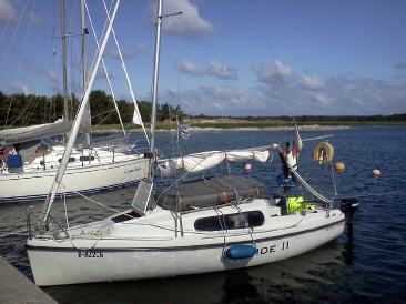 Der Tag fängt sehr Aprilmäßig an. Nieselregen und Windstärke 0! Die See ist spiegelglatt, wir könne jetzt also erstmal in alle Richtungen losfahren und damit tun sich ganz neue Ziele auf. Daher Plan B: wir fahren an Sundland vorbei nach Omø und wollen dann Richtung Femø und von dort Richtung Darß/Hiddensee. Also doch Motor an und los. Nicht gerade Superstimmung bei dem Wetter, aber was soll’s. Muss viel an Lennart denken, er fehlt mir sehr. Es sind zwar „nur“ 2 Wochen, aber seine Nähe fehlt mir doch sehr. Es ist total schön Kinder aufwachsen zu sehen, wie sie mit ihrer Unbedarftheit die Welt erobern, wissbegierig und unvoreingenommen. Da kann man sich manchmal ne Scheibe abschneiden. Das Wetter klart langsam auf. Haben aus Spaß wenigstens die Fock mal rausgelassen. Dachte heute Morgen der Wechselrichter wäre defekt. Nicht gut wegen Kartenplotter. Aber lag nur daran, dass die Batterie voll geladen war und bei Überspannung schaltet er ab. Also alles gut. Im Großen und Ganzen brauchen wir wenig die Karten, da es recht leicht zu navigieren ist und nachdem wir im Vorjahr in den Schären waren, kann uns kaum noch was schocken. 2 bis 3 Mal in die Detailkarten schauen, Übersegler raus und auf geht's, wenn man die markanten Punkte im Blick behält. Den Plotter brauchen wir nur wenn irgendwas unklar ist oder nachts. Hilfreich ist, dass das Kartenprogramm Fotos der Häfen darstellt und man damit ungefähr eine Vorstellung davon bekommt, wie das Ziel aussieht. Hab das Boot geschrubbt und wiedermal die Bilge entwässert. Alles tipp topp für den 2. Teil unserer Reise. Ab morgen warten anscheinend 2 Tage Sonne auf uns. Der Pinnenpilot ist wieder unser bester Freund. 30 sm ohne Rudergang. Bei Motorfahrt finden sich eh kaum Freiwillige an Bord, welche gerne steuern. Nun noch schnell eine 5 Minuten- Terrine, um die Stimmung etwas zu heben. Der fest eingebaute Gaskocher auf dem Schwertkasten erleichtert das Kochen sehr, davor ist noch ne kleine Stellfläche für Töpfe und Tassen und hinten eine Tischplatte für das Kartenmaterial. Da ist also etwas Ordnung drin. Im Vorschiff sind Proviant und Klamotten und Backbord und Steuerbord schlafen wir. Tagsüber sind das Sitzecken und in einer hängt auch der Kartenplotter ständig einsatzbereit an der Wand. Dann noch Teller und Fernglas und Rum usw. in Regalen an der Wand. Das geht so schon ganz gut. Es ist wichtig, dass alles fest verstaut ist und immer seinen selben Platz hat. Da findet man sich auch im dunkeln oder brenzligen Situationen immer gut zurecht, und es ist in der Sitzposition fast alles mit einer Hand erreichbar, ohne sich weiter durch die Kajüte quälen zu müssen, was besonders bei Seegang sehr gut ist. Der Motor brummt und die Segel schlagen, wir ziehen nun einen geraden strich durch die glatte See. Ab und an mal ein Frachter. Lesen und dösen. Die Wellen plätschern harmlos gegen das dünne GFK. Erstaunlich wie anders das auf dem Schlag über die Kieler Bucht war. Kann man sich jetzt fast gar nicht mehr vorstellen. Fahren den Großen Belt hoch, Wetter könnte nicht günstiger sein für uns. Erinnerungen an 2009 werden wach, als wir von Åhus aus durch die Große Belt Brücke gefahren sind bei achterlicher großer Welle und viel Wind, und jetz wirkt alles wie auf dem Müggelsee. Die See hat viele Gesichter. Gegen Nachmittag wird es kurz ganz klar. Mit Schmetterling und strahlendem Sonnenschein und 0 Welle den Belt hoch. Es ist ein Jollentraum. Liege auf dem Vorschiff und schau in die Wölkchen. Der Wind flaut dann leider total ab, so dass wir wieder motoren müssen. Aber es wird endlich mal wärmer. Seit 30 min. verfolgt uns eine Möwe. Sie setzt sich 5 Meter hinter uns ins Wasser und bleibt achteraus, um dann bei einiger Entfernung zu starten und sich wieder hinter uns ins Wasser zu setzen. Sie hält uns wohl für ein Fischerboot. Dieser Vorgang wiederholt sich sehr oft, für uns lustig, für sie dumm gelaufen, da kein Fisch an Bord ist. Laufen am Abend in den Hafen von Omø. Sehr schöner Sonnenuntergang und im Hintergrund die Große Belt Brücke. Der Anblick fasziniert mich, waren wir doch dort wie gesagt 2 Jahre zuvor auf den Wellen nach Agersø geritten. Sitze melancholisch im Sonnenuntergang an Deck und trinke Rum.