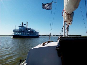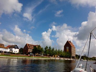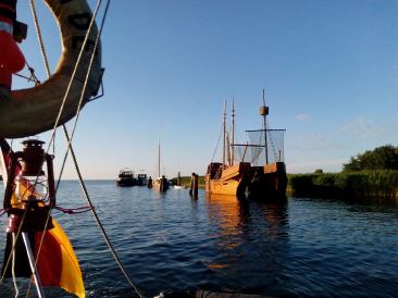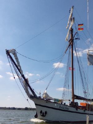 Am nächsten Tag sagt der Wetterbericht Böenwarnungen für die Küste voraus, inklusive Gewitter...machen also früh los und frühstücken halt an Bord, als wir durch die Boddenlandschaft motoren...Wind leider aus SO und daher vorlich...ab Höhe Barth setzen wir alle Segel und kommen ganz gut voran...Ulrike steuert und ich kümmer mich mal um Details an Bord und den aufkommenden Sonnenbrand...27 Grad..wann hat man das mal...es ist sehr schwül und langsam scheint uns das Wetter einzuholen...ab Barhöft wieder Motor...Wind dreht jetzt unerwartet nach West/Nordwest und frischt auf 5 auf, da scheint die Front zu kommen...da er leider wieder zu vorlich kommt, müssen wir weiter motoren...die Wellen haben schon Schaumkronen und wir tanzen munter hin und her, als wir endlich in den Heimathafen Schaprode einlaufen...guter Anleger, schnell Sachen gepackt und Auto geholt, da es langsam finster wird....aber dann reisst es unerwartet wieder auf und blauer Himmel...wir sind verdutzt...es ist weiter nördlich vorbei gezogen...auch gut...noch ein eis und dann geht es leider schon wieder nach Hause zurück...