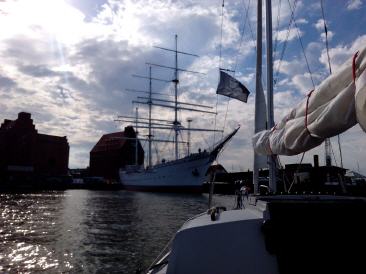 Kaum aufgewacht, ist das Dilemma schon sichtbar. Der Himmel ist voll bedeckt, Windböen und alles diesig...Aber kein Regen und warm. Frühstücken und machen dann los. Erst geht es ganz gut mit Vollzeug, aber dann frischt es doch sehr auf und in den Böen bis 5 Bf. Holen das Groß ein und fahren erstmal mit der Fock weiter. Windrichtung passt und es geht mit 4-5 Knoten flott voran. Auf dem Kubitzer Bodden baut sich schon schnell eine große Welle auf und die Gemütlichkeit schwindet immer mehr. Dann ein erster Schauer und Böen bis 6 Bf. Uns kommt eine riesige Yacht entgegen, welche recht schnell unterwegs ist und wirklich große Wellen wirft. Die Seglern welche er überholt haut es fast um und auch wir kämpfen ganzschön. Kann mich bei soviel unschönem Verhalten nichtmehr beherrschen und zücke entgegen guter Seemannschaft den Mittelfinger. Irgendwann is ja auch mal gut. Zwischen Hiddensee und Rügen wird das echt immer schlimmer...Höhe Schaprode extreme Welle bei dem Südwest. Lassen dann etwas nach und Höhe Vitte schlagen dann Böen bis 7 Bf zu. Zuviel für uns und die Fock. Das Achterstag reißt den Heckkorb teilweise aus der Halterung und Fock bergen geht bei dem Wind nicht mehr, das sie sonnst in Fetzen liegt. Also erstmal weiter. Der Winddruck ist erbarmungslos und ablaufen können wir wegen der Fahrinne auch nicht, wegen zuwenig Raum. Ich halte also den Heckkorb fest und Stefan steuert tapfer weiter. Dann kommt uns eine große Yacht entgegen und damit keimt Hoffnung auf. Kaum ist sie neben uns und wir bekommen etwas Abdeckung, da versuche ich die Fock zu bergen. Es gelingt größtenteils und weiter geht es mit etwas flatternder Fock und Motor. Neben uns im Fahrwasser ein festgefahrener Segler. Aber bei dem Wetter is nichts zu machen, da muss der Seenotkreuzer ran. Nun kommen kurz vor Kloster Wind und Welle extrem von vorne, nehmen viel Wasser über. Bekommen einen halbwegs passablen Anleger hin, welcher großzügig von den Einheimischen kommentiert wird und lecken die Wunden, als kurz die Sonne raus kommt. War am Ende doch noch recht aufregend...Nebenan im Hafenbecken liegt die Albin Köbis, die Welt is klein...