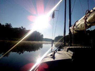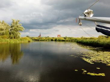 Auf den Schreck erstmal ein Kaffee und die Gedanken ordnen...Der Wetterbericht ist durchwachsen...Sonne und Wind aus West/Südwest...Südwest is doof, wenn man nach West will...fahren noch schnell Benzin holen und bunkern Wasser und dann lege ich auch schon unter Segeln ab, kurze Grundberührung und ich bin wieder auf der Peene. Die Sonne knallt schon jetzt gegen 10 Uhr...