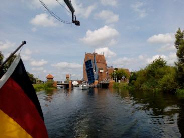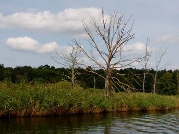 Ab und an kommen mal einzelne Paddler und ganz selten mal ein Hausboot, im wesentlichen bin ich allein auf dem Fluss. Er ist recht breit und tief und hat kaum Strömung. Er fließt auch manchmal je nach Wetterlage auch mal in die Gegenrichtung, da er fast garkein Gefälle hat. Große Schilfflächen säumen den Rand und ab und an gibt es noch Seitenarme vom früheren Torfstechen. Es ist eine Bundeswasserstrasse, aber die Berufsschifffahrt is hier noch toter als anderswo...alles geht über LKW...und überall noch neuere Infrastruktur: Anleger, Brücken, Verladerampen...sie haben es versucht, aber es hat alles nichts genutzt, es ist eine abgekoppelte Gegend...