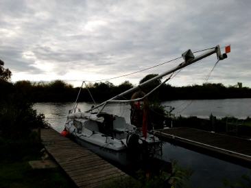Endlich nach langer Zeit wieder am Boot. Diesmal mit meinem Sohn. Der Sommer 2017 macht es einem nicht leicht. Viel Regen und durch die vielen Tiefs oft zuviel Wind. Daher die lange Zeit ohne Boot. Es machte leider keinen Sinn. Es war wohl der meiste Niederschlag seit der Wetteraufzeichnung und es gab viele Überschwemmungen und voll gelaufene Keller...Woche für Woche ging das so...ein Tief nach dem anderen... Das meiste ist nun inzwischen durch und daher wagen wir uns nun mal wieder hierher. Ganzschön verdreckt die ganze Angelegenheit. Daher ist erstmal rundum putzen und klar Schiff machen angesagt. Geht dann aber schneller als gedacht und die Stimmung steigt. Es ist sehr schwül und die Mücken haben ihren Spaß mit uns. Da der Schwertkasten von innen scheinbar mit Muscheln bewachsen ist, lässt sich das Schwert erstmal garnicht mehr runterlassen. Na toll, Superwurst. Versuche mit hoch und runter und hin und her es irgendwie zu wuppen, dabei verliere ich an jeder Hand etwas Haut durch den Abrieb an den Leinen. Stimmung jetzt sehr gedämpft. Dann setze ich nochmal alles auf eine Karte und ziehe wie wild und habe ständig Angst, dass die Leine abreißt. Aber alles geht gut und Schwert ist unten. Die zermatschten Muscheln im Kasten schmatzen und quietschen...Fahre eine Proberunde aus dem Hafen raus und durch das Spiel im Kasten, quetscht es sich endgültig frei...Schwein gehabt...