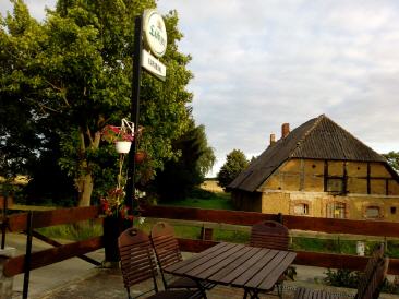 Gehen in den Dorfkrug was essen. Sitzen auf der Außenterasse, schauen auch die Dorfstrasse und gegenüber in der Abendsonne neben einer alten Scheune sitzen hunderte Stare in den Bäumen und zwitschern wie wild. Richtig Dorf, richtig im Nichts, richtig gut. Schlendern entspannt zum Boot zurück und genießen nochmal diesen schönen Platz ganz allein für uns zu haben und verziehen uns dann wegen der Mücken ins Boot. Lesen, labern, Wein und dann schlafen. Der extrem wenig überstrahlte Sternenhimmel mit Milchstraße spiegelt sich im spiegelglatten Peenewasser und am Rand der Mond...sehr schön hier.