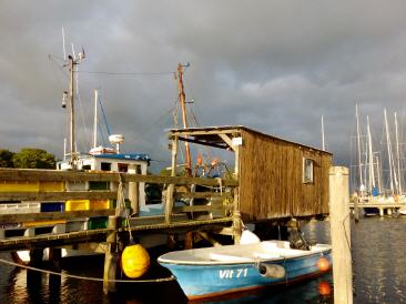 Haben ganz gut geschlafen und machen dann auch bald los. Es ist noch recht diesig, aber es wird schon noch aufreißen. Diesmal umrunden wir das Sperrgebiet am Kreidefelsen mehr als ausreichend, wir sind ja lernfähig...leider ist es immer noch diesig und wolkig und der Königsstuhl zeigt sich daher nicht von seiner schönsten Seite. Dafür frischt aber der Wind auf und wir setzen Segel und endlich schweigt der Jockel. Dazu gesellt sich dann auch noch Sonne und wir gleiten langsam aber entspannt an Sassnitz und den Badeorten Binz, Göhren, Sellin vorbei Richtung Landtief. Kürzen dort wieder ab und können hart am Wind gut Richtung Peenemünde ins Fahrwasser fahren. Bergen Segel und finden in Freest dank der Vorsaison einen sehr schönen Platz am Steg bei Kirstens Yachtwerft. Kurzer Plausch mit Selbiger und dann geht es Fisch essen. Sehr leckerer frischer Hornhecht, trotz der Gräten...dann Sonnenuntergang und Hafenromantik pur...immer wieder schön hier zu sein...für den Moment eine heile Welt, wäre es doch immer so...